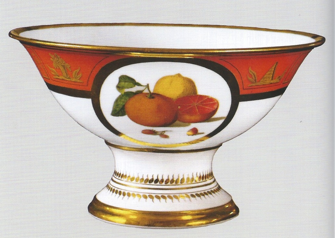 Servizio da pranzo in porcellana di pasta dura. I pezzi presentano un colore di fondo "rouge tomate" cotto sotto smalto al grande fuoco, ravvivato da decorazioni in oro lucido e brunito (tese dei piatti, bordure delle "jattes" di varie forme, corpi dei "confituries"), mentre nei cavetti bianchi dei piati e dei medaglioni risparmiati dei pezzi da portata sono dipinte in policromia composizioni assortite di frutta, vivacizzate talora dalla presenza di un insetto