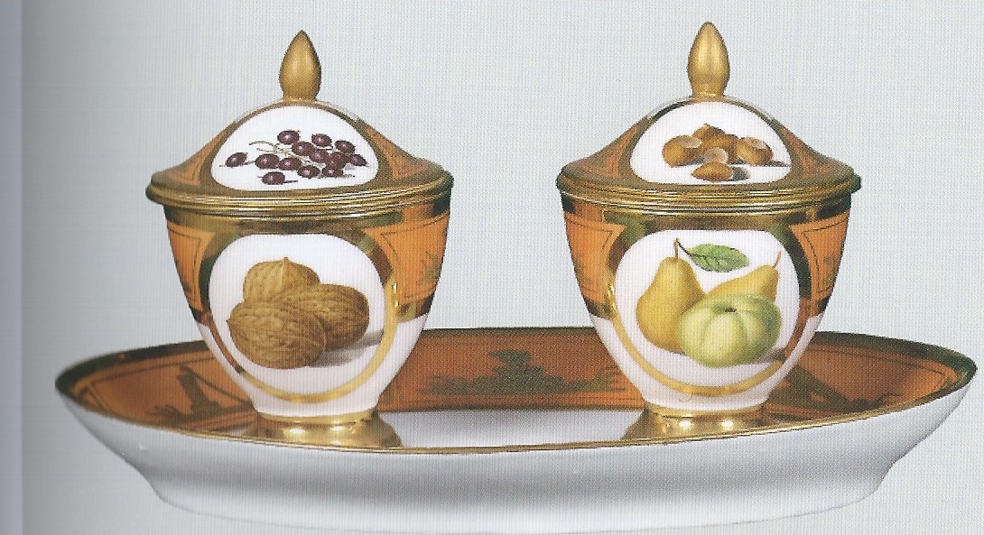 Coppia di portamarmellata su piatto ovale, con coperchietto, che culmina con una pigna dorata. Le coppette sono decorate con due clipei dorati sui due lati. Una coppetta mostra da un lato dei melograni e dall'altro delle noci; sul coperchietto mostra in un clipeo delle pere e nell'altro dei mirtilli. L'altra coppetta mostra in un clipeo dei limoni e nell'altro delle pere e una mela; sul coperchietto mostra in un clipeo dei lamponi e nell'altro delle nocciole