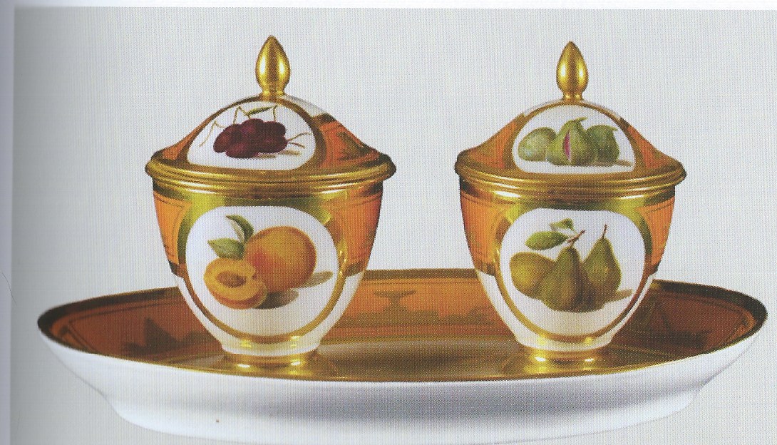 Coppia di portamarmellata su piatto ovale, con coperchietto, che culmina con una pigna dorata. Le coppette sono decorate con due clipei dorati sui due lati. Una coppetta mostra da un lato delle mandorle e una nocciola, e dall'altro delle pesche; sul coperchietto mostra in un clipeo delle pesche e nell'altro delle ciliegie. L'altra coppetta mostra in un clipeo delle mele e nell'altro delle pere; sul coperchietto mostra in un clipeo del ribes bianco e nell'altro delle fichi