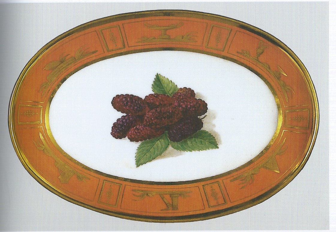 Piatto da portata di forma ovale. Bordo "rouge tomate" con decori in oro. Fondo bianco con more di gelso