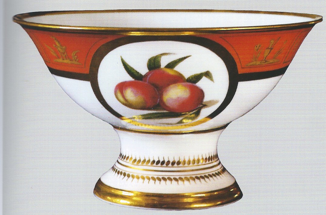 Coppa da frutta a bordo piatto. All'interno della coppa entro clipeo dorato un tralcio di rose rampicanti con una farfalla. La coppa è decorata da un lato con un limone, un'arancia intera e una tagliata a metà e fragole, da un lato con tre pesche con foglie