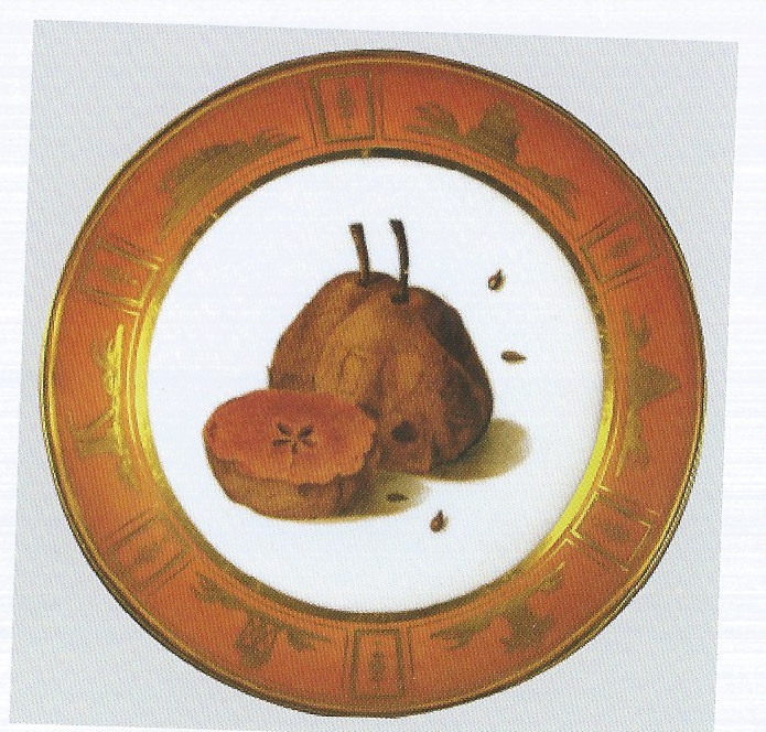 Coppetta rotonda. Bordo "rouge tomate" con decori in oro. Fondo bianco con due pere intere, una mezza pera e i semi del frutto