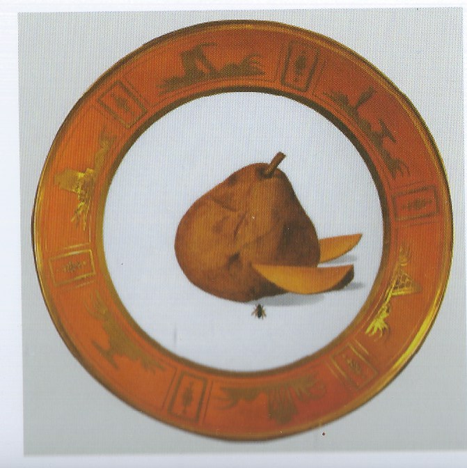 Coppetta rotonda. Bordo "rouge tomate" con decori in oro. Fondo bianco con una pera, fette di pera e una mosca