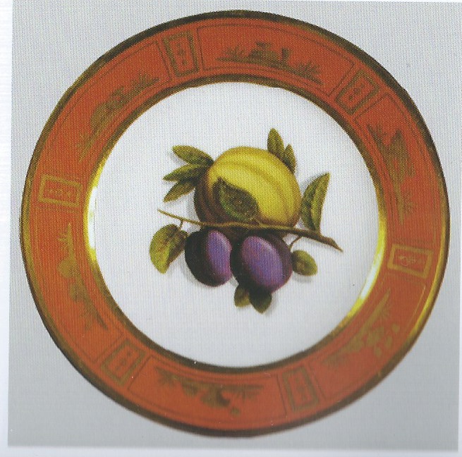 Piatto rotondo da dolce. Bordo "rouge tomate" con decori in oro. Fondo bianco con un melone, due prugne e foglie
