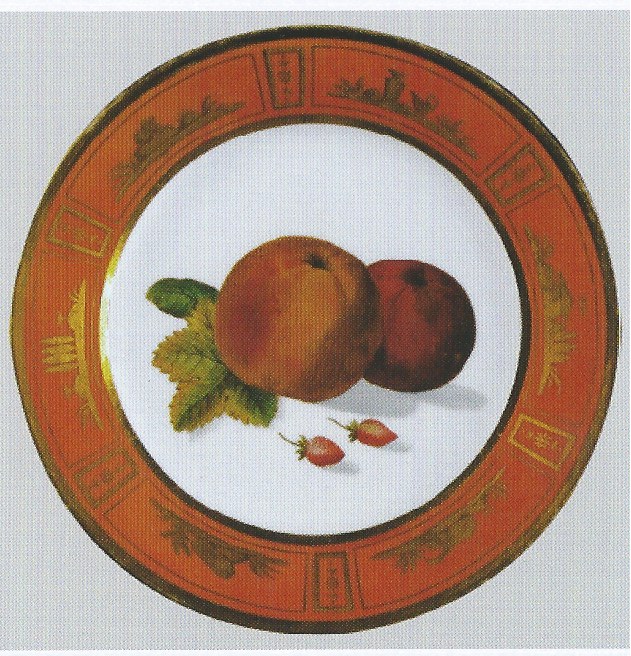 Piatto rotondo da dolce. Bordo "rouge tomate" con decori in oro. Fondo bianco con due mele e due fragole