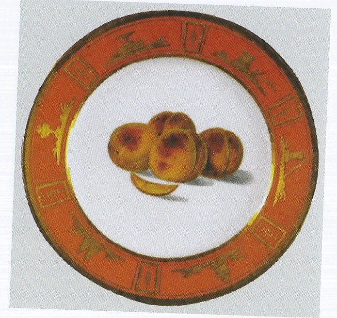 Piatto rotondo da dolce. Bordo "rouge tomate" con decori in oro. Fondo bianco con delle pesche gialle