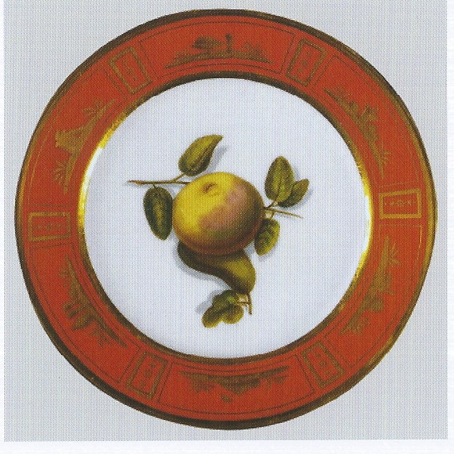 Piatto rotondo da dolce. Bordo "rouge tomate" con decori in oro. Fondo bianco con una pera, una mela e foglie
