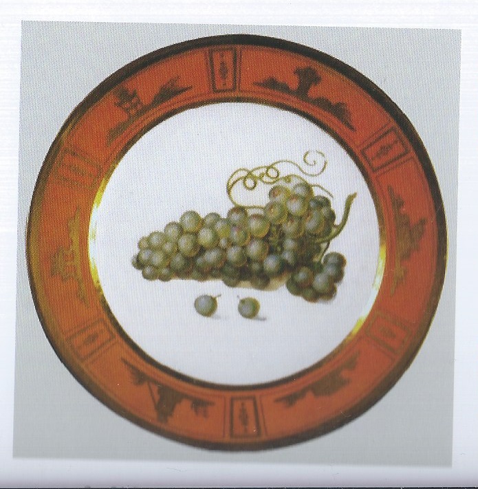 Piatto rotondo da dolce. Bordo "rouge tomate" con decori in oro. Fondo bianco con un grappolo d'uva bianco