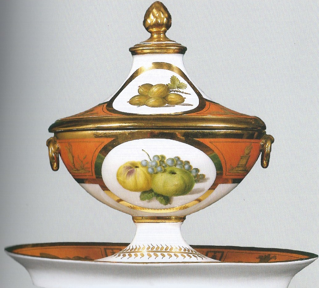 Portamarmellata a forma di urna su piatto ovale, con coperchio. La coppa è decorata da due clipei dorati sui due lati: uno racchiude dei melograni, delle prugne e delle ciliegie, l'altro delle mele e dell'uva. Ai lati due anelli dorati. Il coperchio è decorato anch'esso con clipei: uno con lamponi, l'altro con uva spina bianca. In alto culmina con una pigna dorata