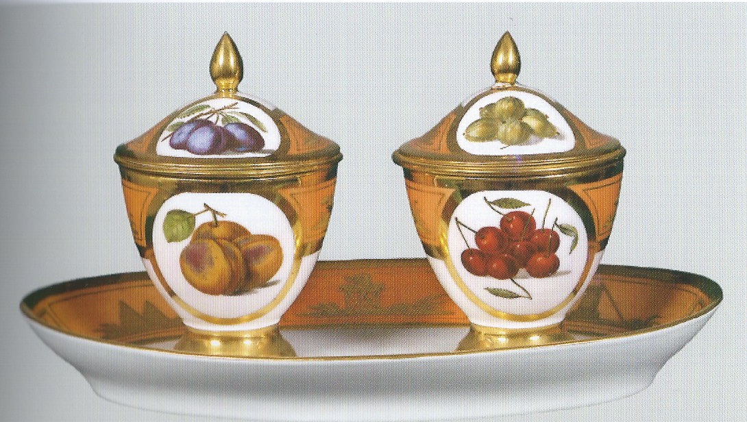 Coppia di portamarmellata su piatto ovale, con coperchietto, che culmina con una pigna dorata. Le coppette sono decorate con due clipei dorati sui due lati. Una coppetta mostra da un lato dell'uva nera e dall'altro delle pesche; sul coperchietto mostra in un clipeo delle fragole e nell'altro delle prugne. L'altra coppetta mostra in un clipeo delle fragole e nell'altro delle ciliegie; sul coperchietto mostra in un clipeo delle albicocche e nell'altro dell'uva spina bianca