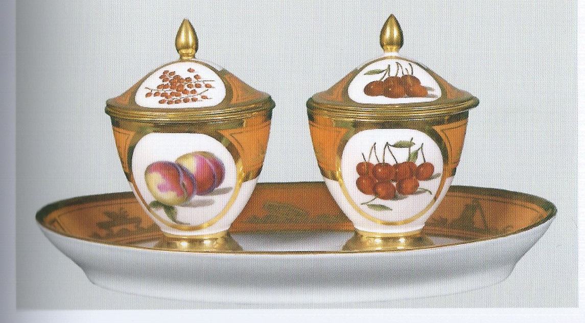 Coppia di portamarmellata su piatto ovale, con coperchietto, che culmina con una pigna dorata. Le coppette sono decorate con due clipei dorati sui due lati. Una coppetta mostra da un lato delle pere e dall'altro delle pesche; sul coperchietto mostra in un clipeo delle giuggiole e nell'altro del ribes. L'altra coppetta mostra in un clipeo dell'uva e nell'altro delle ciliegie; sul coperchietto mostra in un clipeo delle susine e nell'altro delle ciliegie