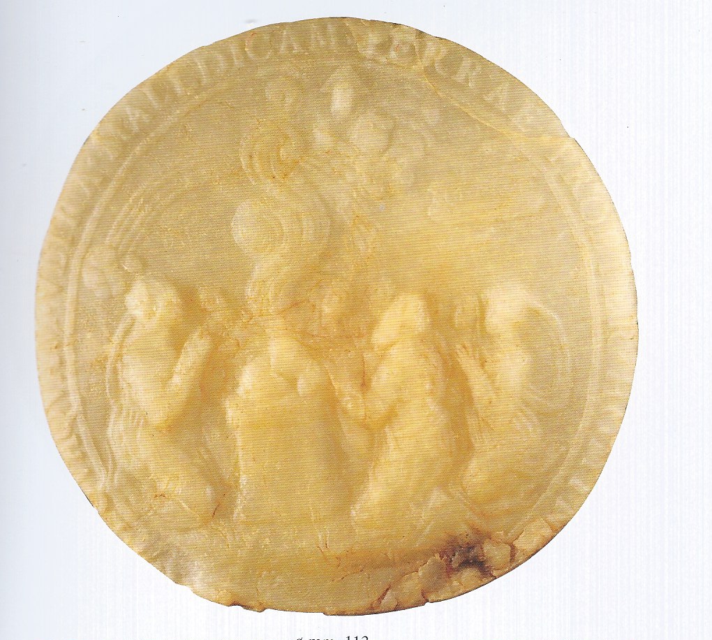 medaglione rotondo di cera con decori impressi su entrambi i lati