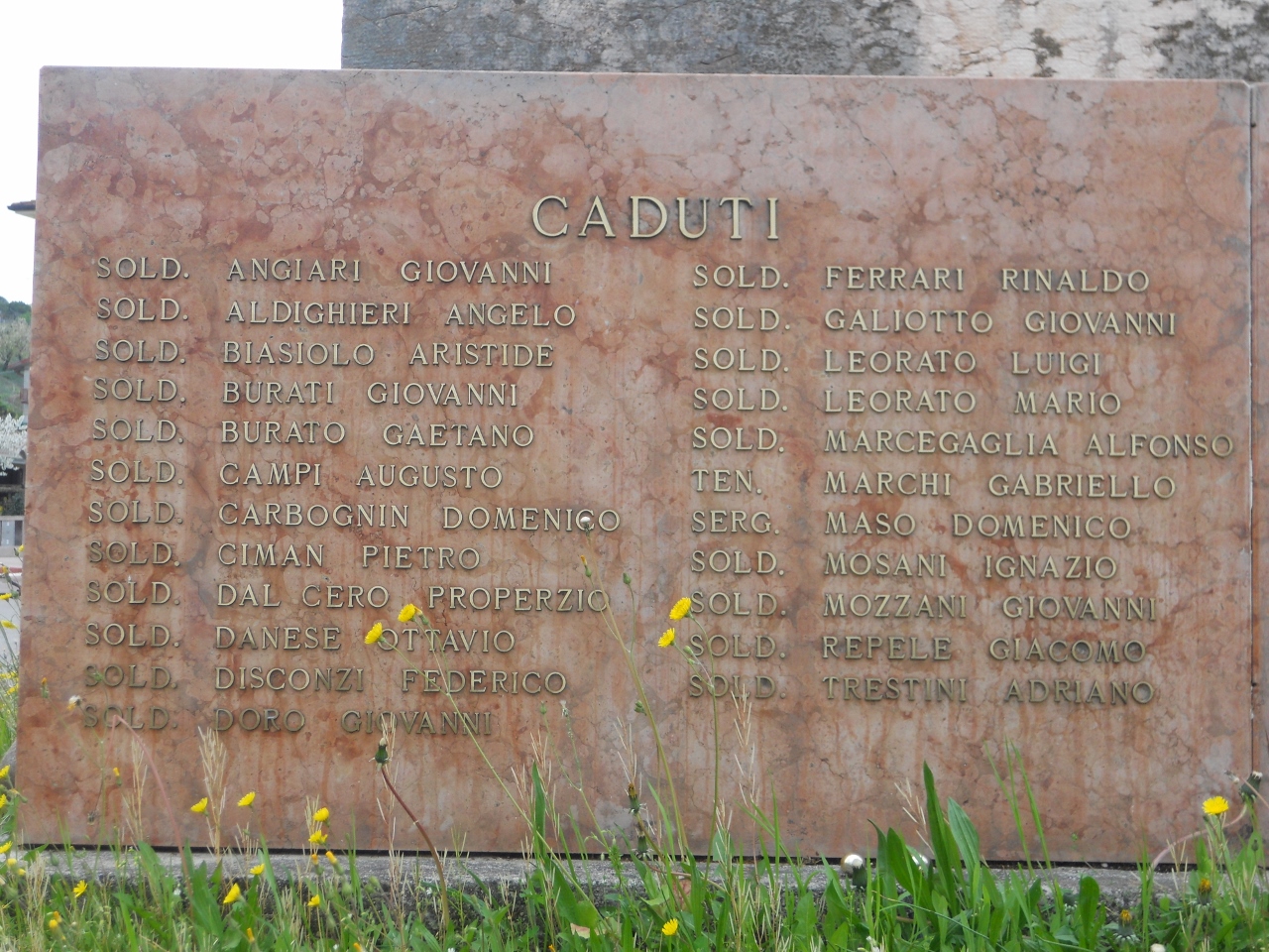 - NOTIZIE STORICO CRITICHE Il monumento in origine era circondato da un piccolo gruppo di piante d'alto fusto sul cui tronco erano state appese le targhe con i nomi dei caduti. Col tempo quegli alberi sono stati tagliati e attorno è stato realizzato un grande parcheggio. Cfr. Montecchia di Crosara. A quando un monumento ai nostri caduti?, in «Il Corriere del Mattino», 20 ottobre 1920; Montecchia di Crosara. Pro Caduti, in «Il Corriere del Mattino», 31 ottobre 1920; Da Montecchia di Crosara. Pesca Pro Monumento, in «L’Arena», 21 settembre 1921; Da Montecchia di Crosara. L’inaugurazione del monumento ai caduti, in «L’Arena», 28 settembre 1922; Trevisan G., Memorie della Grande Guerra. I monumenti ai Caduti di Verona e provincia, Cierre, Sommacampagna 2005, p. 81