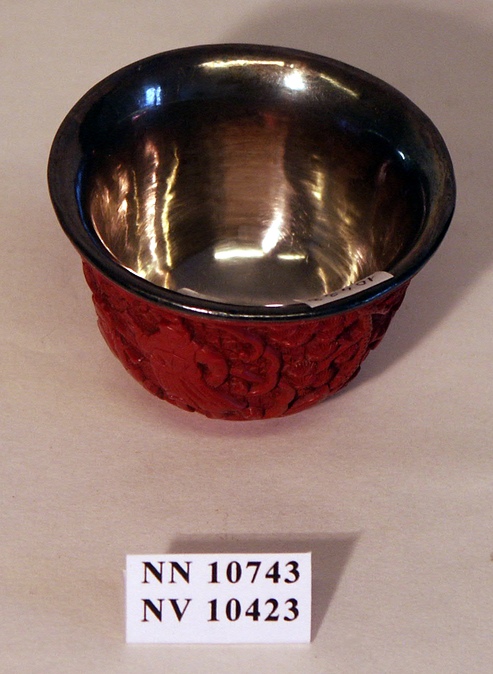 Coppetta per alcoolici in lacca rossa intagliata con rivestimento interno in metallo. Decorazione raffigurante paesaggio con figure umane, su fondo con fiori entro cellette esagonali