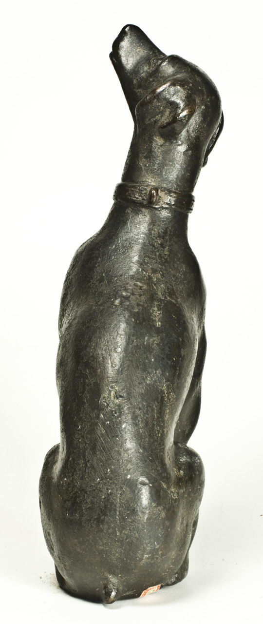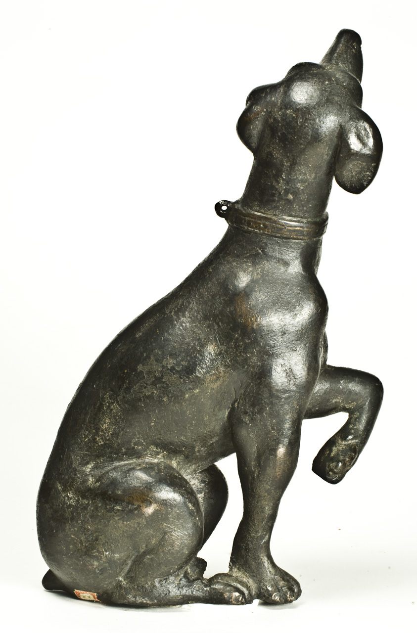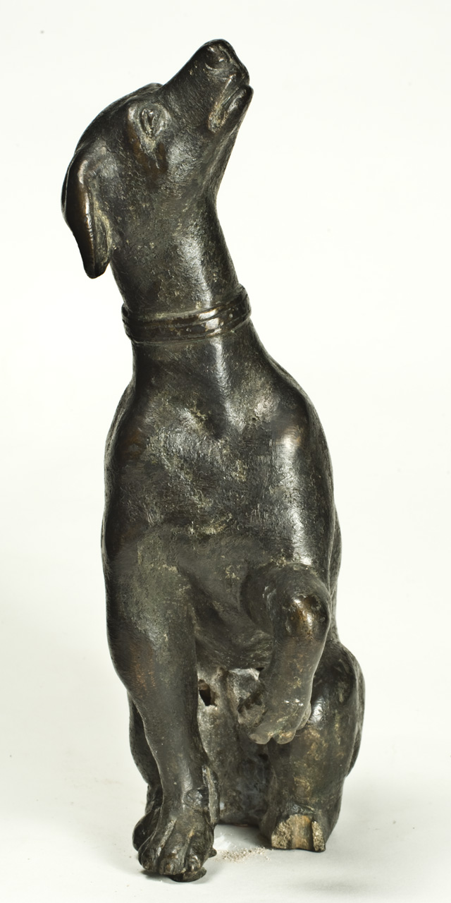Cane seduto, con muso rivolto in alto a sinistra e zampa anteriore sinistra sollevata. Fusione cava; patina bruna