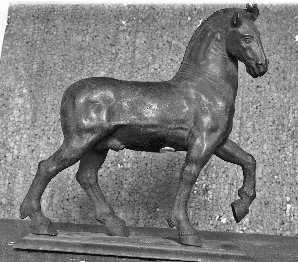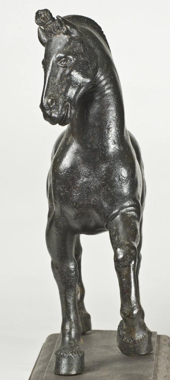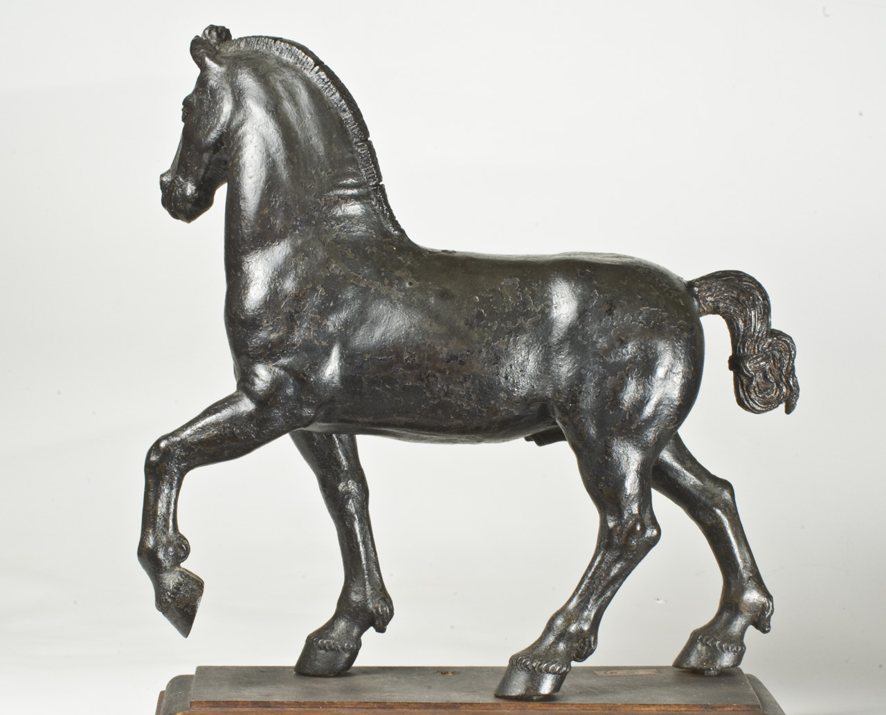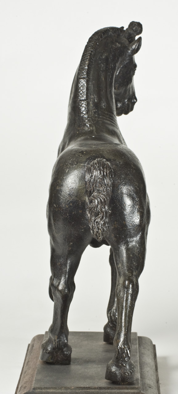 - NOTIZIE STORICO CRITICHE Provenienza: collezione G. A. Molin, già con il Cavaliere Br. 245; Accademia di Belle Arti di Venezia, 1816; quindi nel Reale Museo Archeologico con sede in Palazzo Ducale, ca. 1895; depositato presso la Galleria Giorgio Franchetti alla Ca’ d’Oro, ca. 1926. Variante di una statuetta equestre nota in numerosi esemplari, il cui tipo era probabilmente ispirato agli schizzi di Leonardo per i monumenti – mai completati – di Francesco Sforza e di Gian Giacomo Trivulzio (Fogolari, Nebbia, Moschini 1929); secondo Weihrauch (1956) il modello riprende le pose dei cavalli sulla facciata della basilica di San Marco. Convenzionalmente associato al Cavallo al passo conservato al Bayerisches Nationalmuseum di Monaco (Weihrauch 1956), il bronzetto trova confronti nei musei di New York, Metropolitan Museum of Art, Frick Collection; Berlino, Bode Museum (Krahn 2003); San Pietroburgo, Ermitage (Androsov 2008); Modena, Galleria Estense (Bode 1906-12); Praga, Národní Galerie (Krahn 2003); per una più completa analisi delle varianti note, si veda Wixom (1975). Cfr. anche Cavallo, Br. 191
