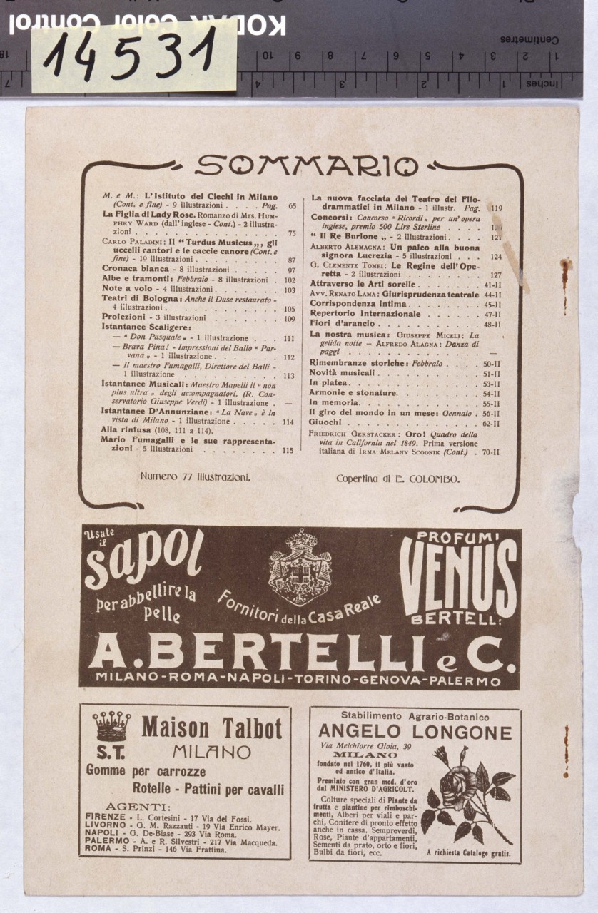 Lettura iconografica: figura maschile; maschera; pierrot; musica; chitarra. Categoria merceologica/ tipo evento: informazione e comunicazione; editoria; periodico mensile; cultura. Nomi: Musica e Musicisti; Giulio Ricordi. Luoghi: Milano