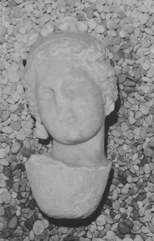 Il frammento rappresenta una testa femminile leggermente inclinata verso destra rispetto al corpo. I capelli sono raccolti e l'acconciatura è impreziosita da coroncine