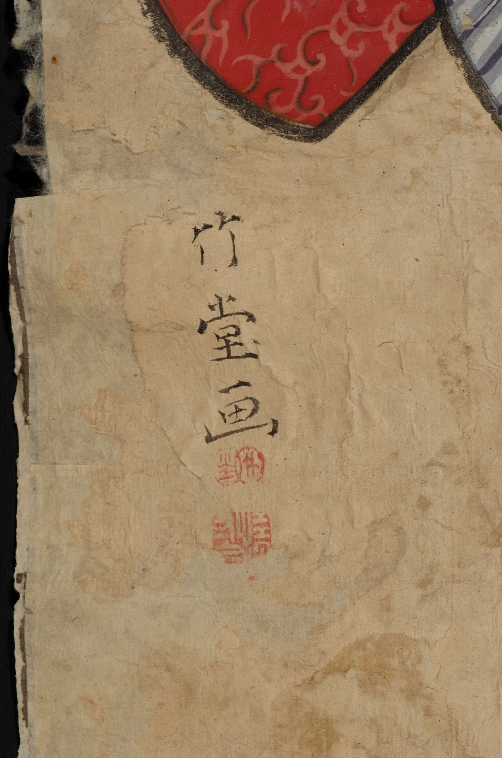 Dipinto su carta, elemento principale per un eventuale rotolo dipinto daappendere. Foglio incollato su un supporto di carta e issato su unastecca di legno sottile per permettere l'avvolgimento