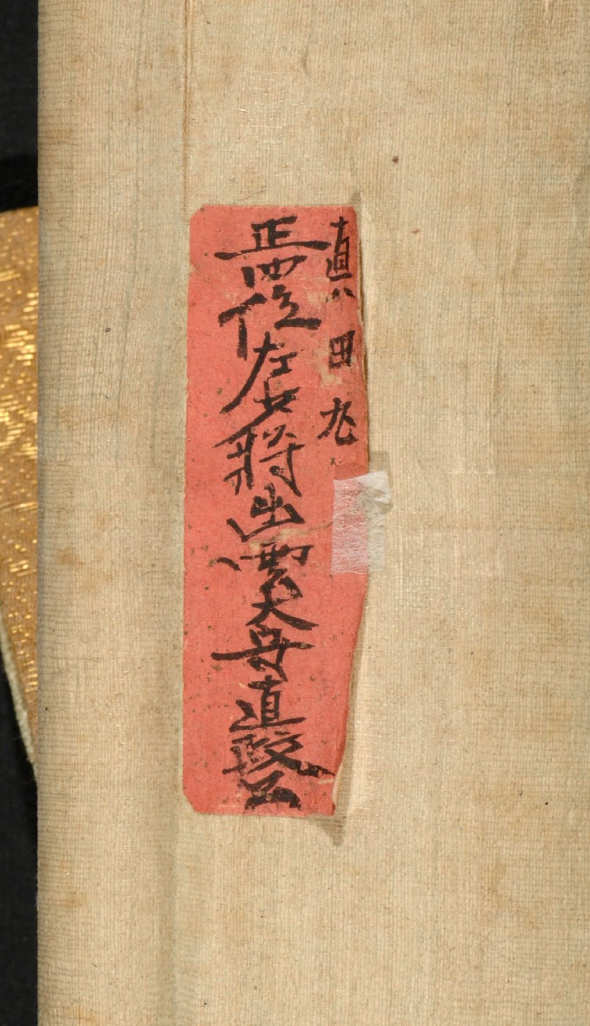 - ISCRIZIONI retro del rotolo a destra su un cartiglio rosso applicato - Sanadamaru Shôshii Sasôshô Izumo no Taishu Naomasa ga (traduzione:Sanadamaru - immagine di Izumo no Taishu Naomasa titolato Shôshii Sasôshô) - lettere capitali - a matita -