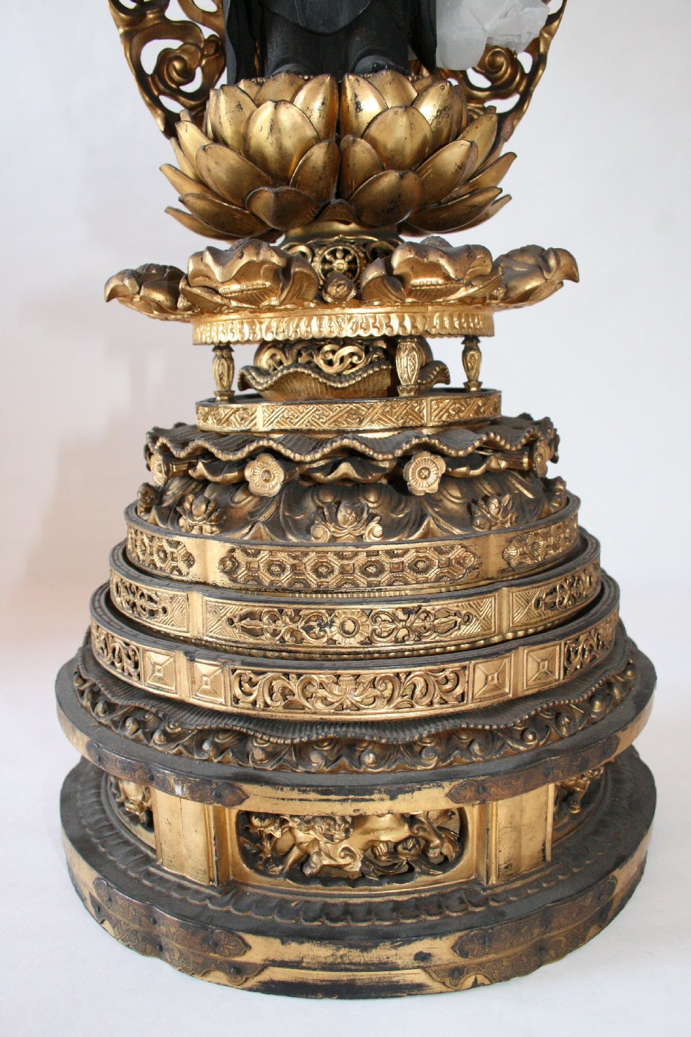 Statua di buddha Amida in simasana con mani in Amidamudra, poggiata su un piedistallo lavorato ad intaglio e traforo, decorato con simboli buddhisti