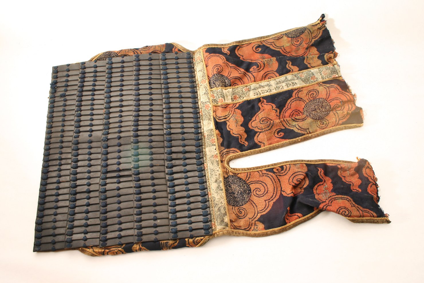 Gonna per armatura divisa in due pezze; la parte superiore è in seta blu con ricami a nuvola di colore rosso, arricchita da fasce in pelle chiara dipinta con piccoli fiori rossi e caratteri; la parte inferiore è a piastre laccate legate da fili in seta blu scuro