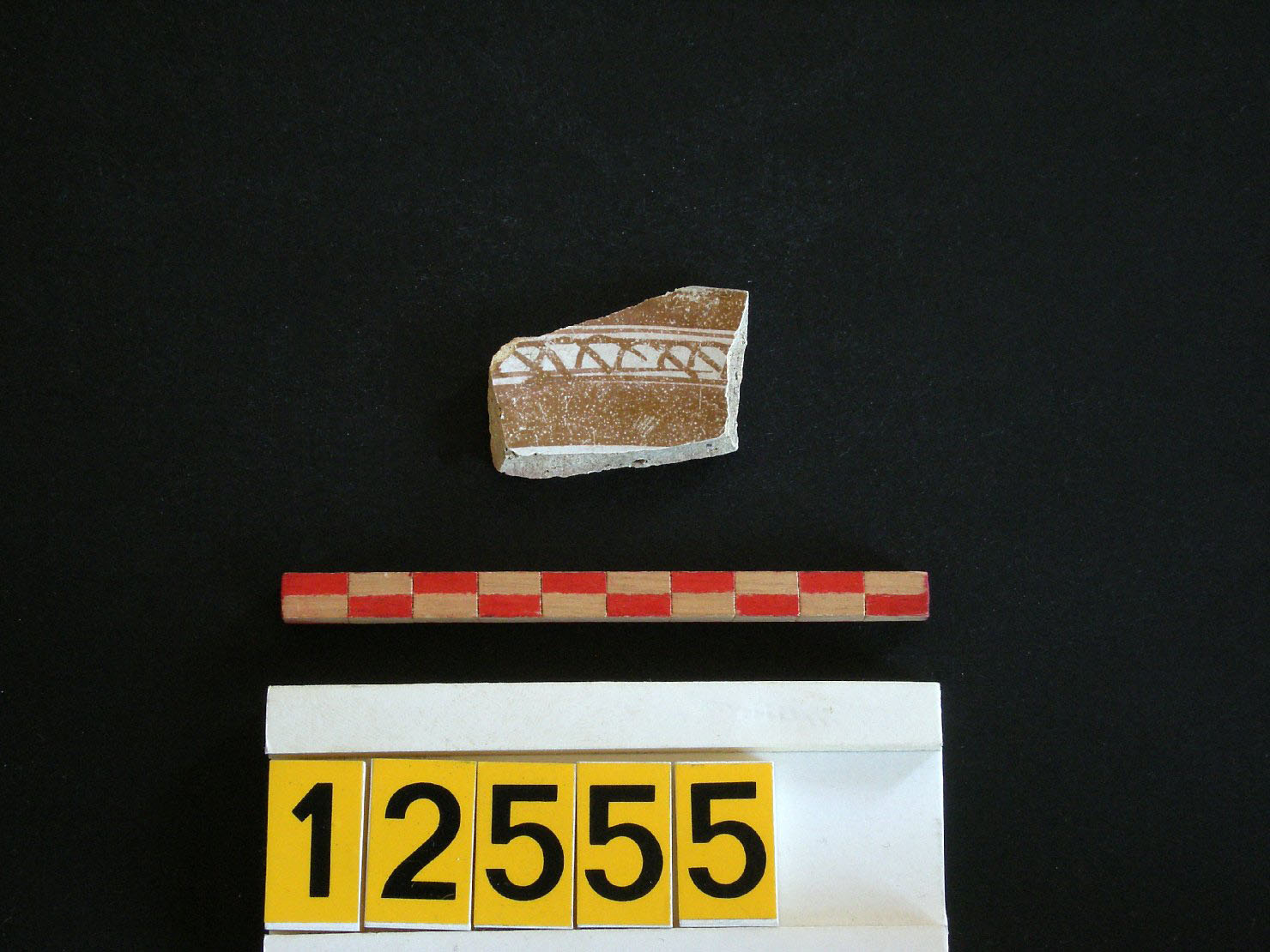 frammento di parete di scodella. interno: decorazione a lustro con banda di archetti incrociati. esterno: decorazione a lustro. impasto color avorio e rosato presso le pareti