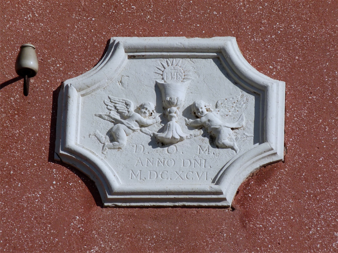 due angioletti in volo reggenti Calice Eucaristico e sottostante iscrizione incisa; una cornice modanata mistilinea racchiude il tutto