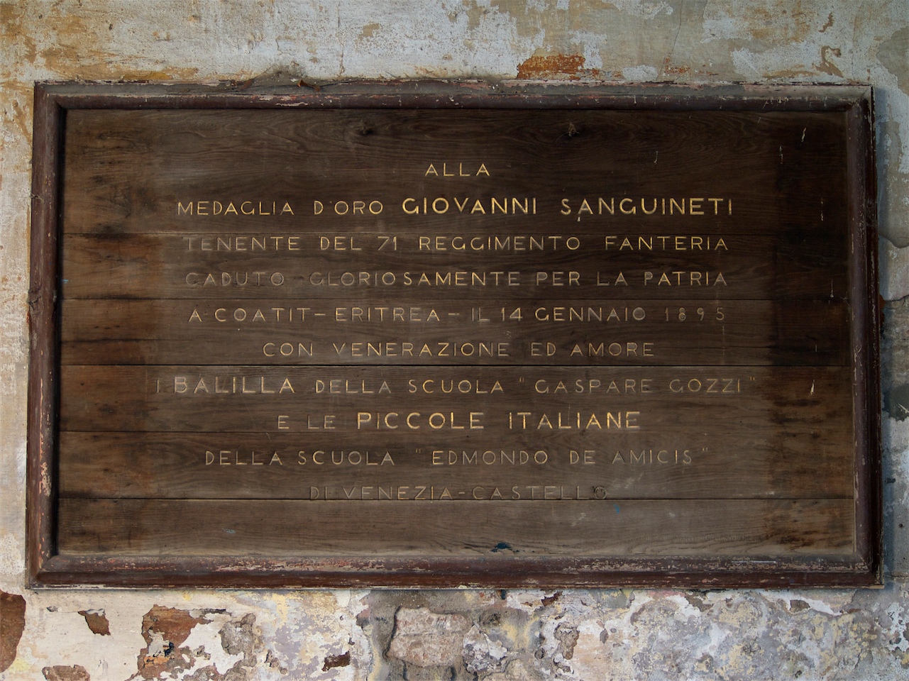 - NOTIZIE STORICO CRITICHE l’iscrizione è a commemorazione di un valoroso tenente appartenente al 71 reggimento fanteria, Giovanni Sanguinetti (1865–1895) che ferito mortalmente, volle rimanere sul campo di battaglia morendo il 14 gennaio 1895 a Coatit, in Eritrea. Per tale atto gli venne conferita una medaglia d’oro. La targa fu donata dai Balilla della scuola “Gaspare Gozzi” e dalle Piccole Italiane dell'istituto scolastico “Edmondo De Amicis” presso il sestiere veneziano di Castello. L’anno di fabbricazione è riportato nell’iscrizione nell’angolo inferiore destro: “LAB. SCUOLA ARTE DEL LEGNO – VENEZIA 1935”. L’edificio, al quale è affissa tale iscrizione, un tempo caserma (in epoca Lombardo–Veneta) durante il periodo fascista fu intitolata a “Giovanni Sanguinetti”. Precedentemente l’immobile era sede patriarcale. Lo storico Tassini nel suo libro “Edifici di Venezia: distrutti o volti ad altro uso” così parla del Palazzo: «Sorse nel secolo XIII ad uso prima dei vescovi Olivolensi, o Castellani, e poscia dei patriarchi di Venezia. Rifabbricossi nel secolo XVI dal patriarca Antonio Contarini, che vi fece dipingere nella gran sala i ritratti de’ suoi predecessori. Questa sala aveva pure il soffitto dipinto da Palma il Giovane, e nella chiesetta interna v’era una tavola di Girolamo Forabosco. Trasportata la sede patriarcale a S. Marco nel 1807, il palazzo anzidetto consegnossi alle truppe di Marina»