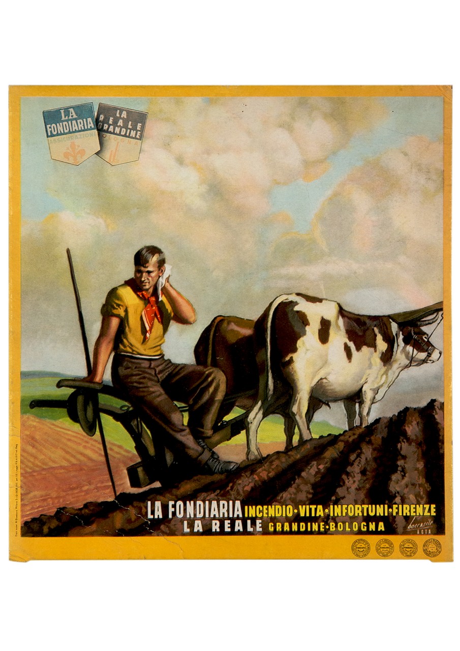Lettura iconografica: figura maschile; contadino; attività umane; aratura; paesaggio; campo dissodato; campi coltivati. Categoria merceologica/ tipo evento: attività finanziarie e assicurative; assicurazioni; polizza incendi; polizza sulla vita; polizza infortuni; polizza agricola. Nomi: La Fondiaria Assicurazioni; La Reale grandine. Luoghi: Firenze; Bologna