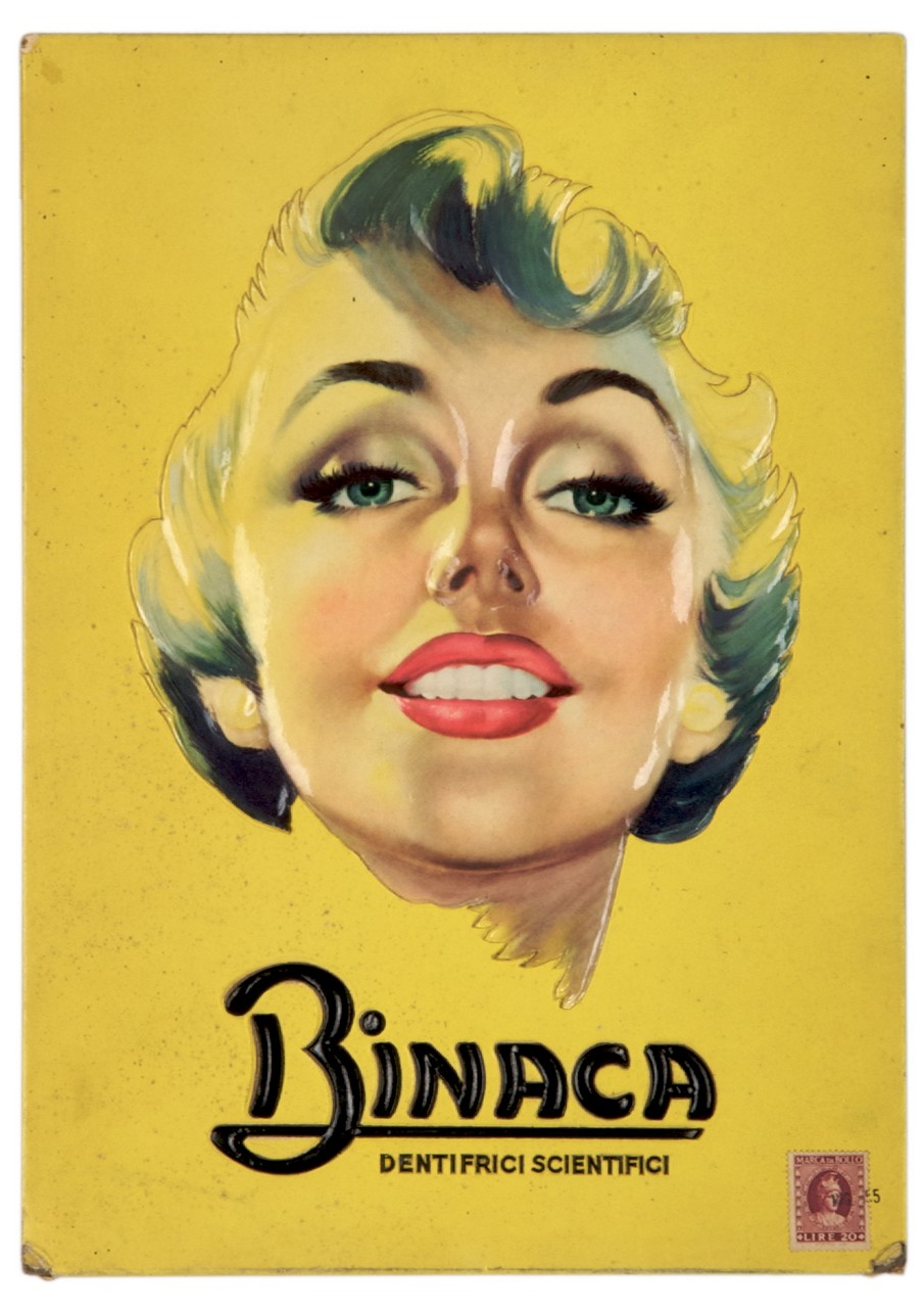 Lettura iconografica: volto di donna. Categoria merceologica/ tipo evento: industria chimica; prodotti per l’igiene personale; dentifricio. Nomi: Binaca; CIBA S.A.I. Luoghi: Milano