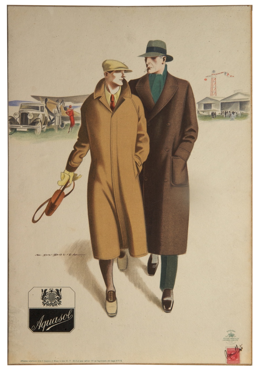 Lettura iconografica: figure maschili; soprabiti; figura femminile; aeroplani; automobile; aviorimesse; torre anemoscopio; manica a vento. Categoria merceologica/ tipo evento: industria tessile; abbigliamento; soprabiti; impermeabili. Nomi: Aquasol