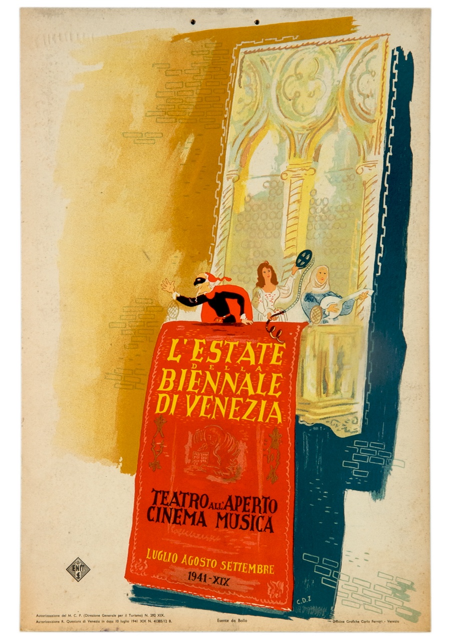 = Lettura iconografica: figura maschile; figure femminili; balcone; maschere del Carnevale. Categoria merceologica/ tipo evento: spettacolo; teatro; musica; cinema; rassegne; turismo; enti di promozione turistica. Nomi: Biennale di Venezia; Enit; Ente nazionale per l’incremento delle Industrie Turistiche. Luoghi: Venezia