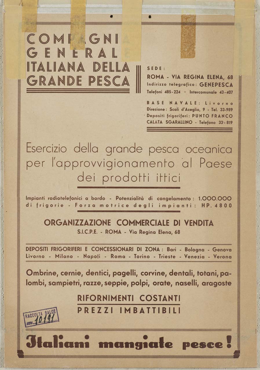Lettura iconografica: braccio; tridente tricolore; pesce; mare; nave. Categoria merceologica/ tipo evento: pesca; pesca marina; commercio; organizzazione commerciale. Nomi: Compagnia Generale Italiana della Grande Pesca; Genepesca; Organizzazione Commerciale di Vendita; S.I.C.P.E.; SICPE. Luoghi: Bari; Bologna; Genova; Livorno; Milano; Napoli; Roma; Torino; Trieste; Venezia; Verona