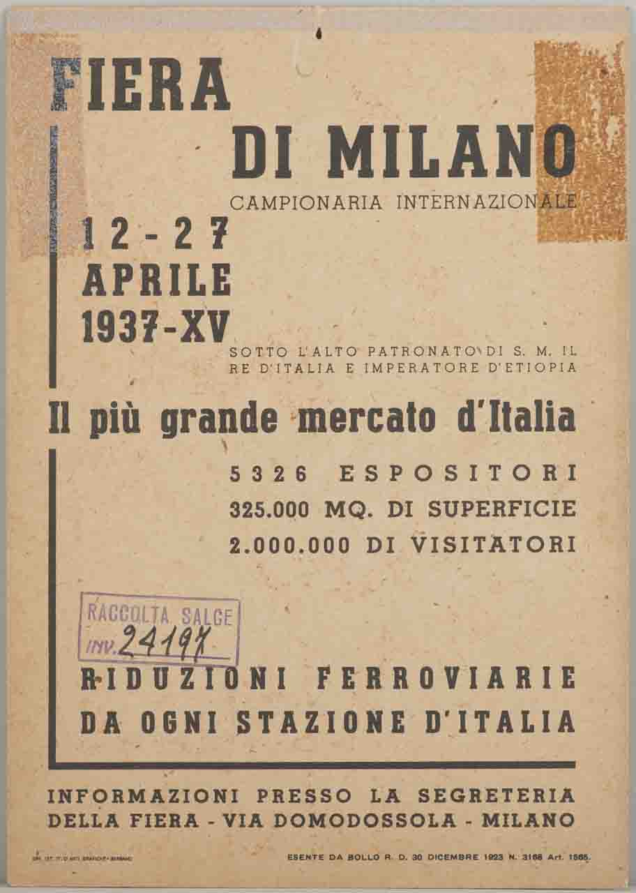 Lettura iconografica: fascio littorio; globo terrestre; bandiere. Categoria merceologica/ tipo evento: commercio; industria; artigianato; agricoltura; fiere; riduzioni ferroviarie; istituzioni; re d'Italia; imperatore d'Etiopia. Nomi: Fiera di Milano campionaria internazionale. Luoghi: Milano