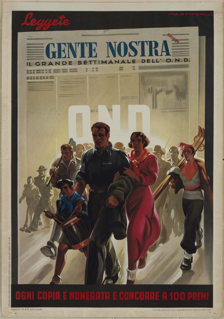 Lettura iconografica: rivista; copertina; figure maschili; figure femminili; divise militari; ragazzo; sci; tamburo militare da parata; zappa. Categoria merceologica/ tipo evento: informazione e comunicazione; propaganda fascista; editoria; periodico settimanale; associazioni culturali; Nomi: Milizia Volontaria per la sicurezza Nazionale; Partito Nazionale Fascista; Balilla; Benito Mussolini; Gente Nostra; OND; Opera Nazionale Dopolavoro