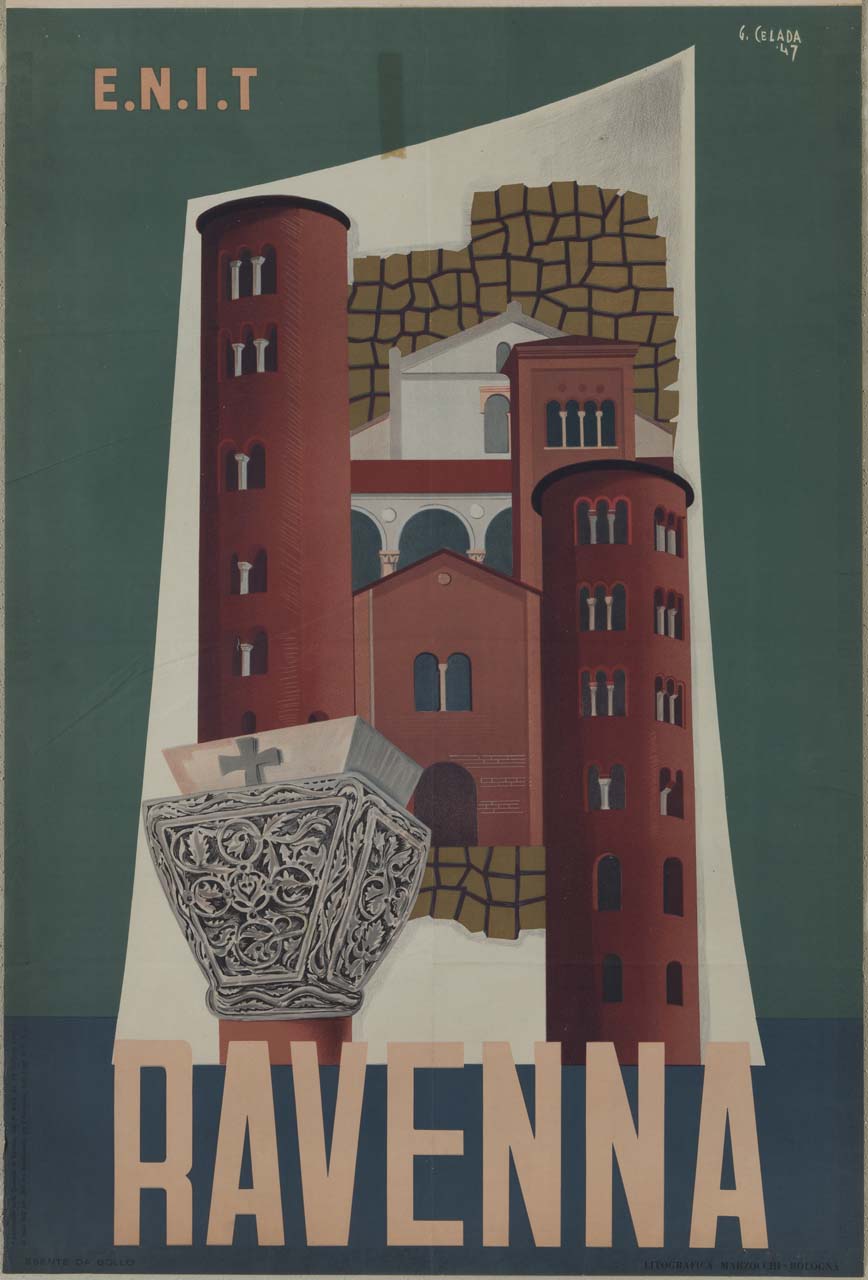 Lettura iconografica: architetture; basiliche; chiese; campanili; sculture; colonne; capitelli. Categoria merceologica/ tipo evento: turismo; città; enti di promozione turistica. Nomi: ENIT; Ente nazionale per l'Incremento delle Industrie Turistiche; basilica di Sant'Apollinare Nuovo; basilica di Sant'Apollinare in Classe; basilica di San Vitale; chiesa di San Francesco. Luoghi: Italia; Ravenna