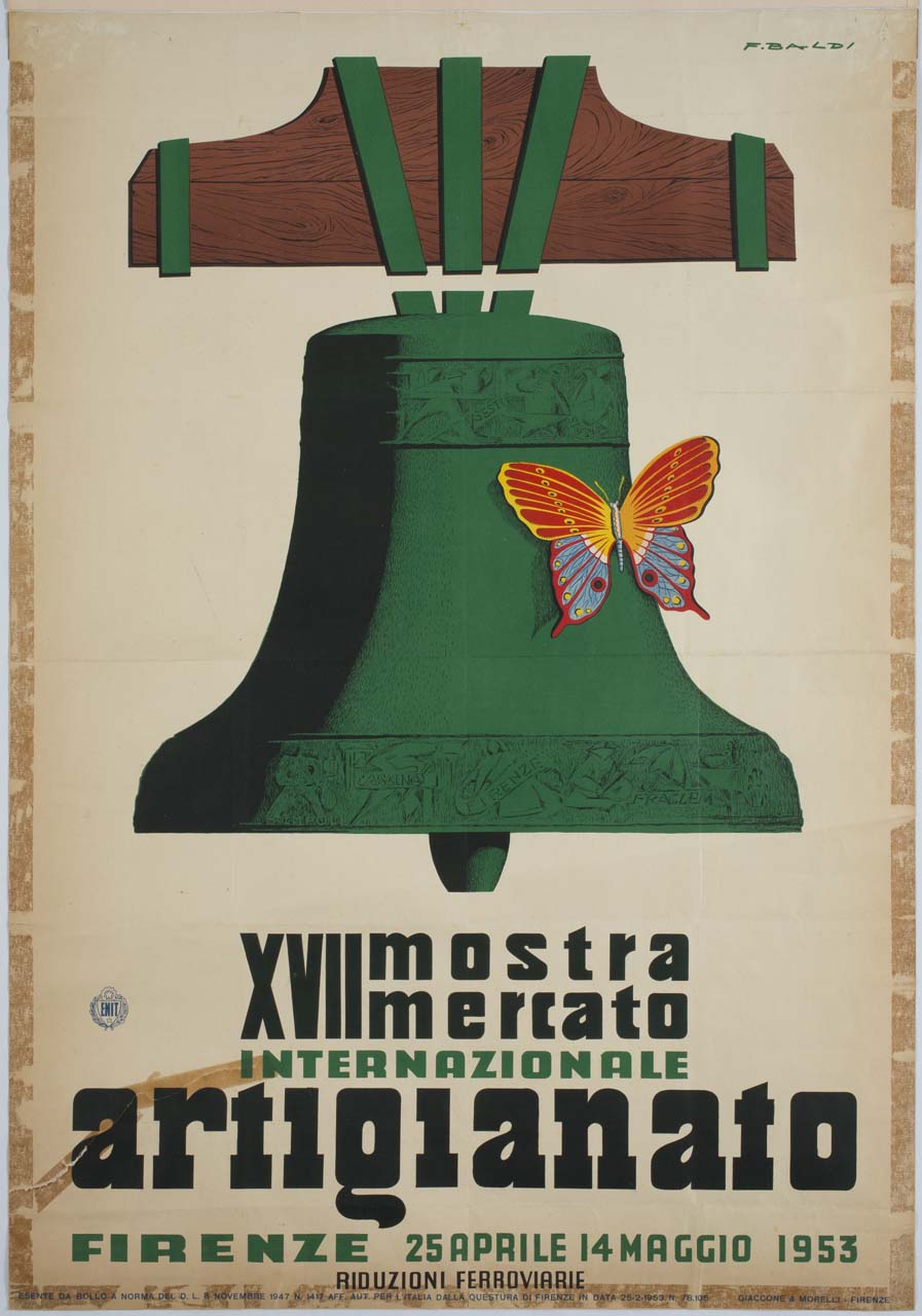 Lettura iconografica: campana; farfalla. Categoria merceologica/ tipo evento: artigianato; commercio; mostre mercato; riduzioni ferroviarie. Nomi: XVIII Mostra mercato internazionale artigianato; ENIT; Ente Nazionale per l'incremento delle Industrie Turistiche. Luoghi: Firenze