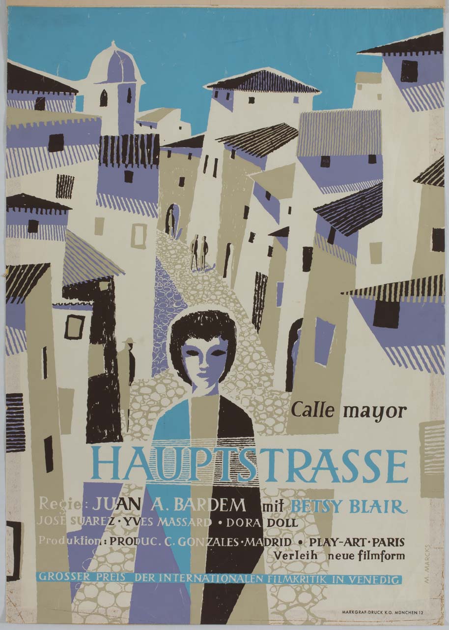 Lettura iconografica: figura femminile; figure maschili; veduta di città. Categoria merceologica/ tipo evento: cinema spagnolo; casa di produzione cinematografica; casa di distribuzione cinematografica. Nomi: Calle Major; Hauptstrasse; Juan Antonio Bardem; Betsy Blair; José Suárez; Yves Massard; Dora Doll; Cesáreo González Producciones Cinematográficas; Play Art; Neue Filform; Grosser Preis der internationalen Filmkritik in Venedig. Luoghi: Spagna; Madrid; Francia; Parigi; Venezia