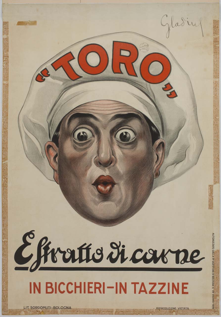Lettura iconografica: figura maschile; testa; cuoco. Categoria merceologica/ tipo evento: industria alimentare; preparati per brodi; dado da brodo; prodotti a base di carne. Nomi: Toro