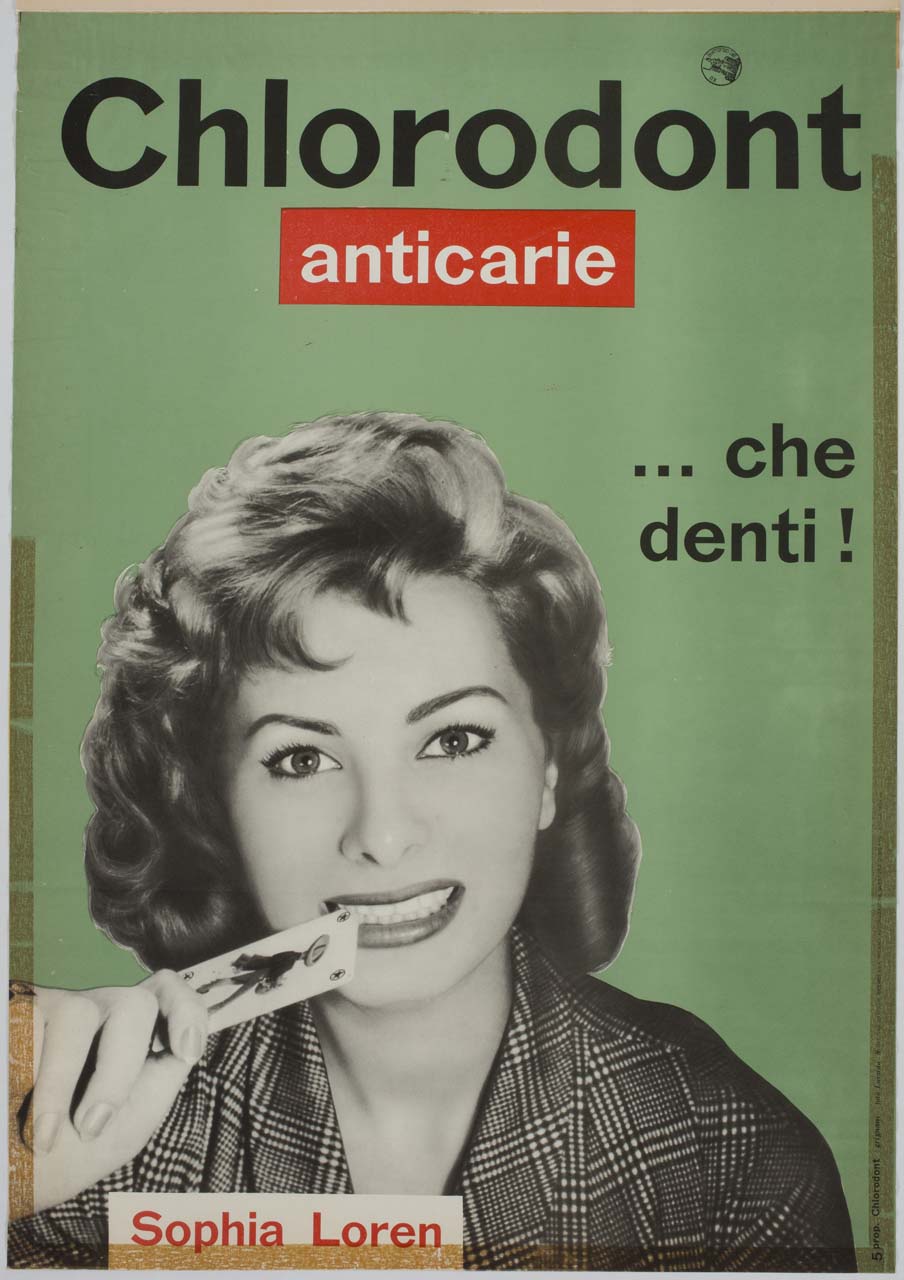 Lettura iconografica: figura femminile; ritratto; carta da gioco. Categoria merceologica/ tipo evento: industria farmaceutica; preparati farmaceutici; anticarie. Nomi: Chlorodont; Sophia Loren