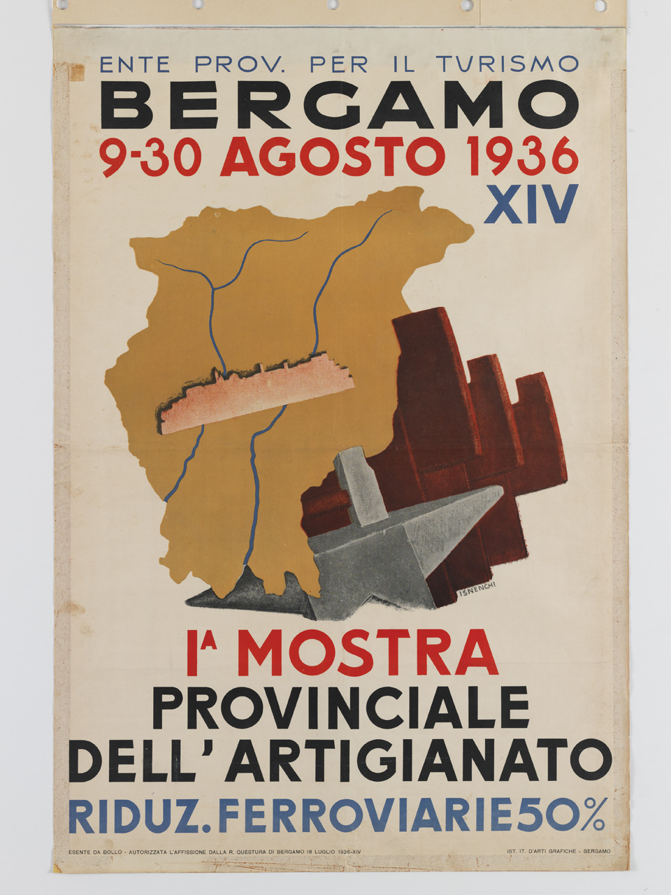 Lettura iconografica: carta geografica; veduta di città; fascio littorio; incudine; martello. Categoria merceologica/ tipo evento: commercio; artigianato; mostre mercato; turismo; enti di promozione turistica; riduzioni ferroviarie. Nomi: Ente Provinciale per il Turismo Bergamo; I Mostra Provinciale dell'Artigianato. Luoghi: Bergamo