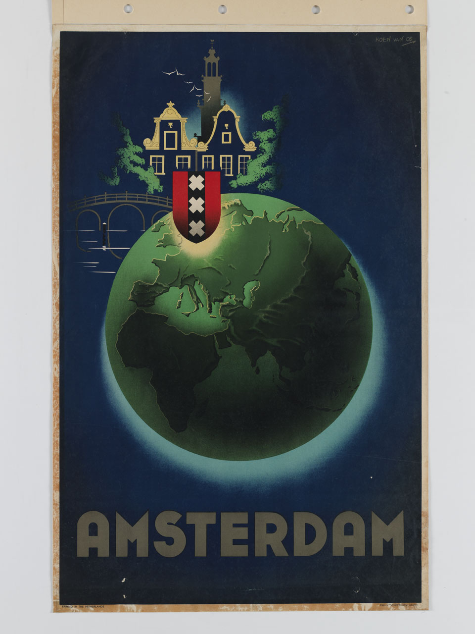 Lettura iconografica: globo terrestre; emisfero orientale; veduta di città; ponte; palazzo; Montelbaanstoren; stemma. Categoria merceologica/ tipo evento: turismo. Nomi: Amsterdam. Luoghi: Paesi Bassi; Olanda; Amsterdam