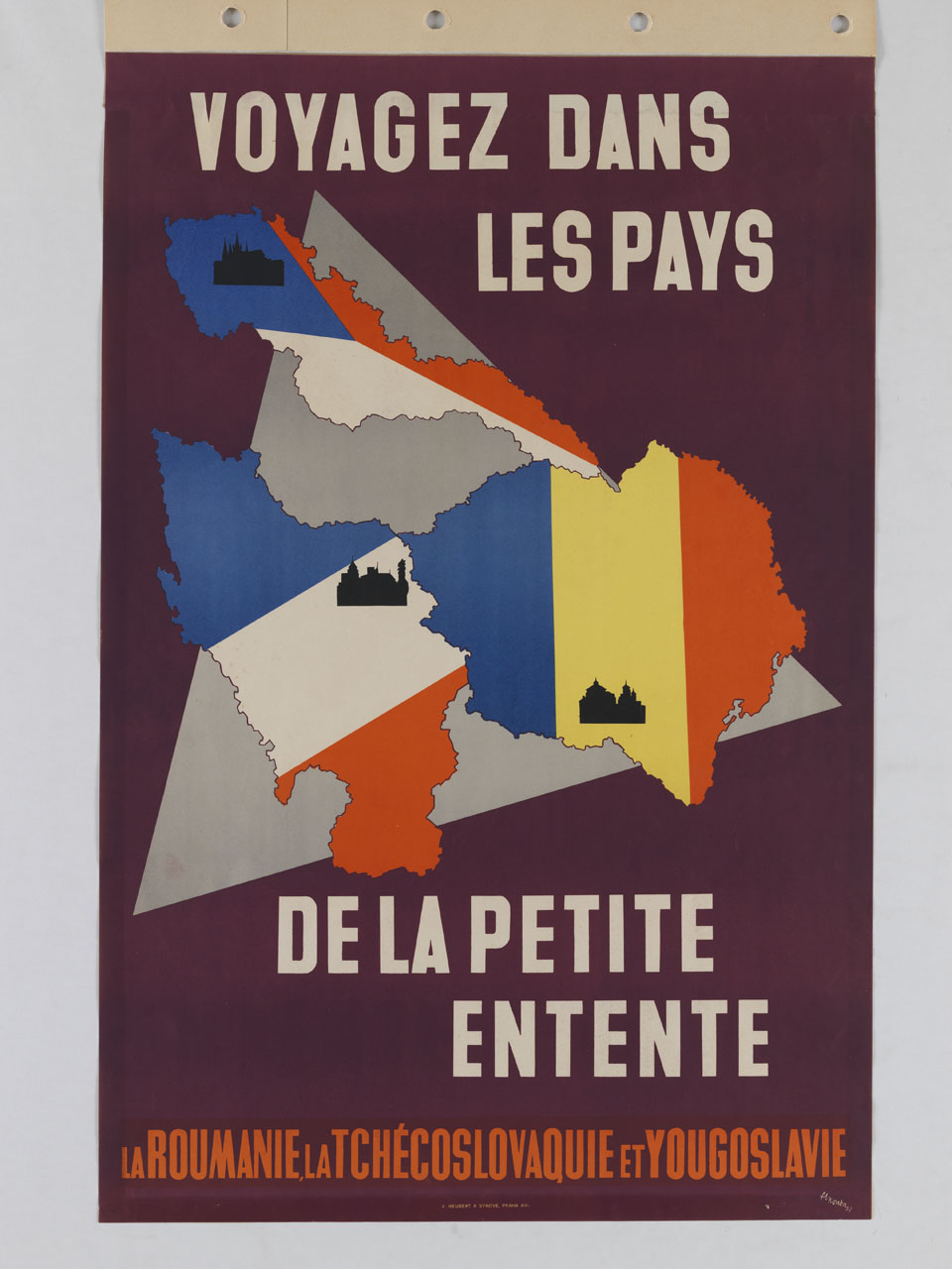 Lettura iconografica: cartina; bandiere. Categoria merceologica/ tipo evento: turismo; politica; associazioni economiche. Nomi: Petite Entente; Piccola Intesa; Roumanie; Romania; Tchécoslovaquie; Cecoslovacchia; Yougoslavie; Jugoslavia. Luoghi: Repubblica Ceca