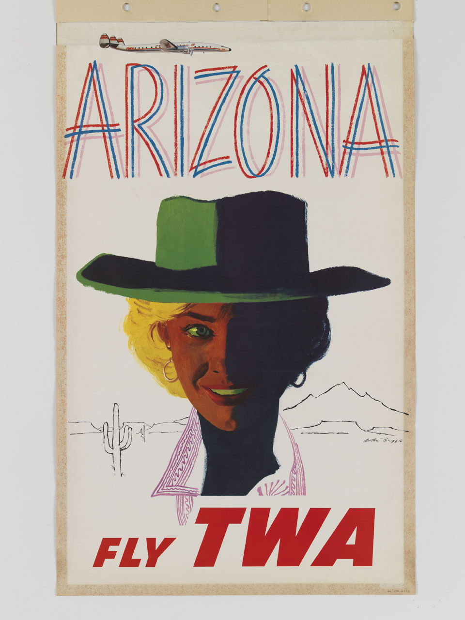 Lettura iconografica: aeroplano; figura femminile; cappello; paesaggio stilizzato; deserto; colline; cactus. Categoria merceologica/ tipo evento: trasporti; trasporto aereo; compagnia aerea; aeroplano. Nomi: TWA; Trans World Airlines; Lockheed L-1649 Starliner. Luoghi: USA; United States of America; Stati Uniti d'America; Arizona