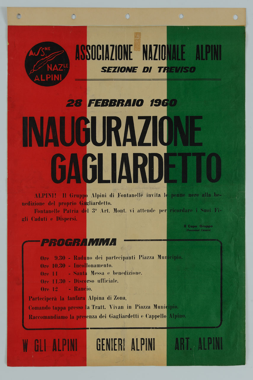- ISCRIZIONI in alto, a metà e in basso - ASSOCIAZIONE NAZIONALE ALPINI/ SEZIONE DI TREVISO/ 28 FEBBRAIO 1960/ INAUGURAZIONE/ GAGLIARDETTO/ ALPINI! Il Gruppo Alpini di Fontanelle invita le penne nere alla be-/ nedizione del proprio Gagliardetto./ Fontanelle Patria del 3° Art.[iglieria] Mont.[agna] vi attende per ricordare i Suoi Fi-/gli Caduti e Dispersi./ Il Capo Gruppo/ (Possamai Cesare)/ PROGRAMMA/ Ore 9.30 - Raduno dei partecipanti Piazza Municipio./ Ore 10.30 - Incolonnamento./ Ore 11 - Santa Messa e benedizione./ Ore 11.30 - Discorso ufficiale./ Ore 12 - Rancio./ W GLI ALPINI GENIERI ALPINI ART.[IGLIERIA] ALPINI - stampatello -