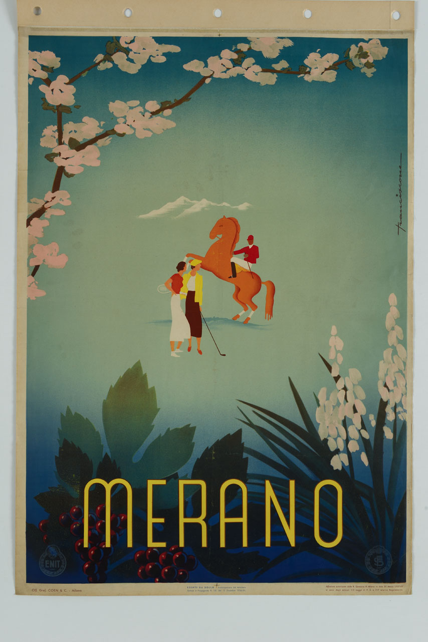 Lettura iconografica: paesaggio montano; figure femminili; racchetta da tennis; mazza da golf; figura maschile; cavallo; ribes; orchidea bianca; ramo di melo in fiore. Categoria merceologica/ tipo evento: turismo; enti di promozione turistica. Nomi: ENIT; Ente Nazionale per l'incremento delle Industrie Turistiche; Ferrovie dello Stato. Luoghi: Bolzano; Merano