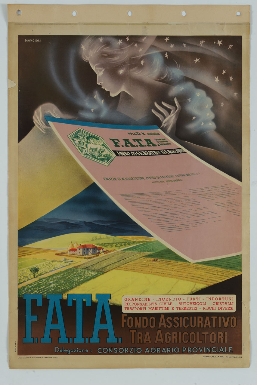 Lettura iconografica: figura femminile; stella; foglio; campo; casa colonica; montagna; cielo; albero. Categoria merceologica/ tipo evento: attività finanziarie e assicurative; assicurazioni; polizza agricola. Nomi: FATA; Fondo Assicurativo Tra Agricoltori; Gruppo Federconsorzi; consorzio agrario provinciale