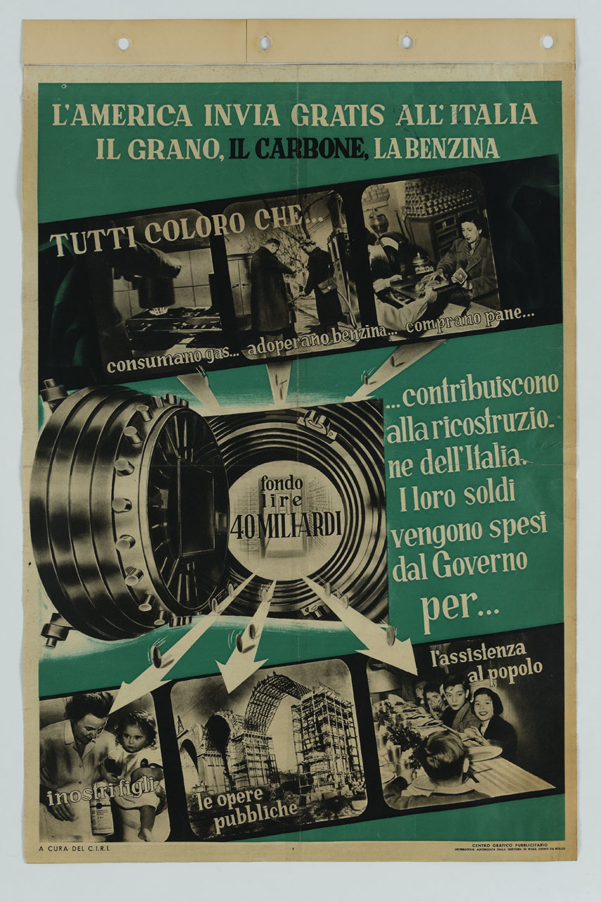 Lettura iconografica: cassaforte; porta blindata; deposito di banca; frecce; monete; figure maschili; figure femminili; bambini; fornelli a gas; pentola; distributore di benzina; automobile; interno di negozio; pane; prodotti alimentari; lattine; bottiglia; viadotto in costruzione; impalcature; mensa scolastica; piatti. Categoria merceologica/ tipo evento: guerra; Seconda guerra mondiale; ricostruzione; informazione e comunicazione; propaganda filoamericana; istituzioni; organi legislativi ed esecutivi centrali; Governo. Nomi: CIRI; Piano Marshall; ERP; European Recovery Program. Luoghi: America; USA; Stati Uniti d’America; Italia