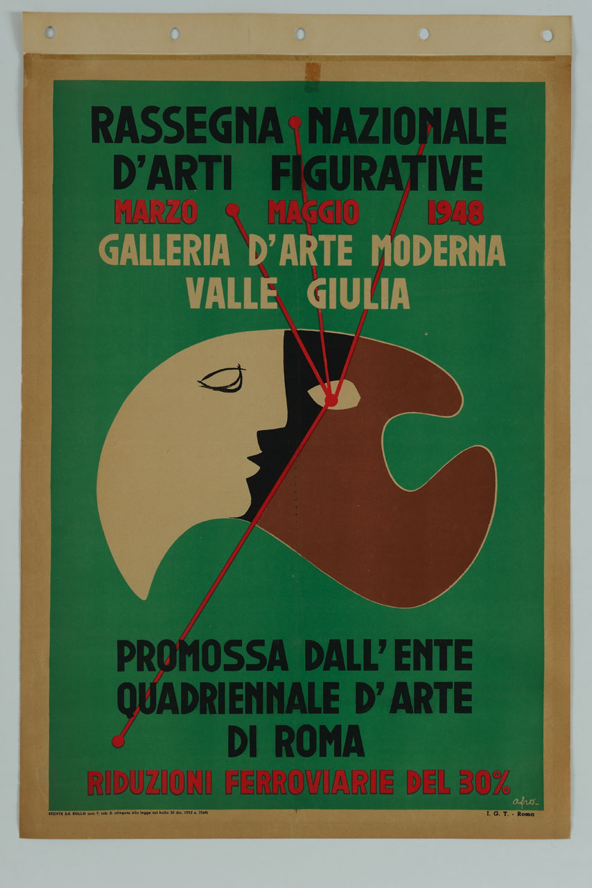 Lettura iconografica: tavolozza; volto di profilo. Categoria merceologica/ tipo evento: manifestazioni culturali; esposizioni; esposizione d'arte; rassegne; istituzioni culturali; riduzioni ferroviarie. Nomi: Rassegna nazionale d'arti figurative; Galleria d'Arte moderna Valle Giulia; Ente quadriennale d'Arte di Roma. Luoghi: Roma